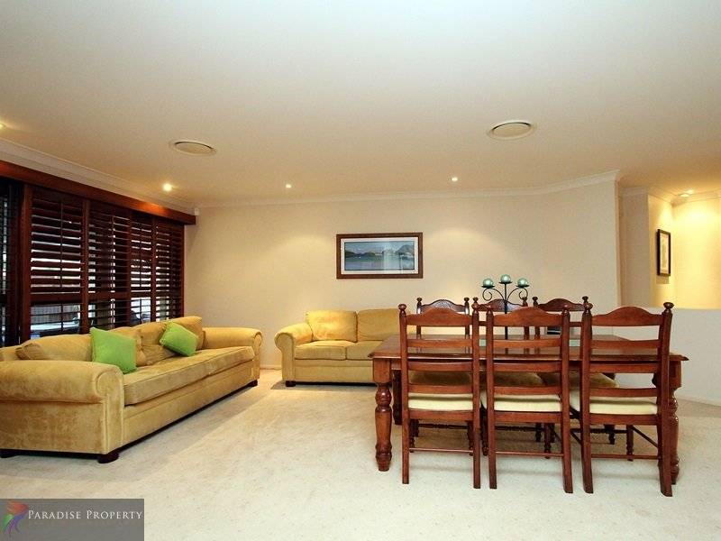 Here you are greeted by the central formal living and dining that offers plenty of space to showcase your taste in design and provides glimpses of the great outdoors through quality plantation shutters and sliding glass doors.