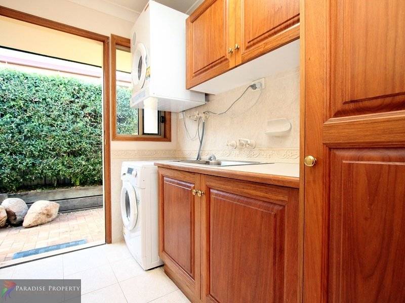 Leading off to the left you’ll find 2 good-sized bedrooms (each with BIRs + ducted air-conditioning); the main bathroom with bath, shower and floor-to-ceiling wall tiles; a separate powder room and toilet; and a good-sized laundry with ample storage and bench space.