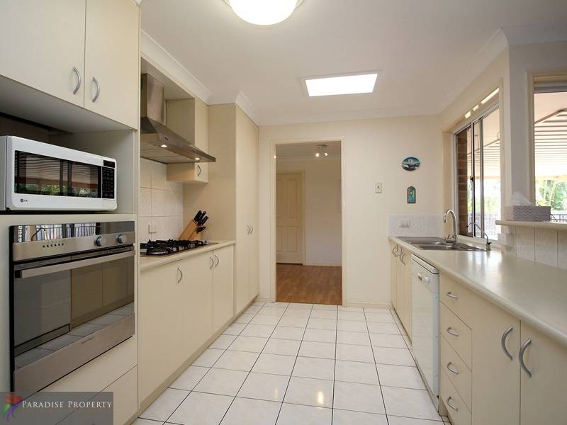 A galley style kitchen separates the formal dining and family room and is well-equipped with quality appliances including near new gas cook top, electric oven and ducted range hood + dishwasher, filtered water and plenty of cupboard and bench space too. There’s also a handy servery area from the kitchen window to the outdoor entertaining for added convenience.