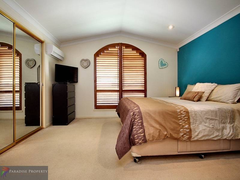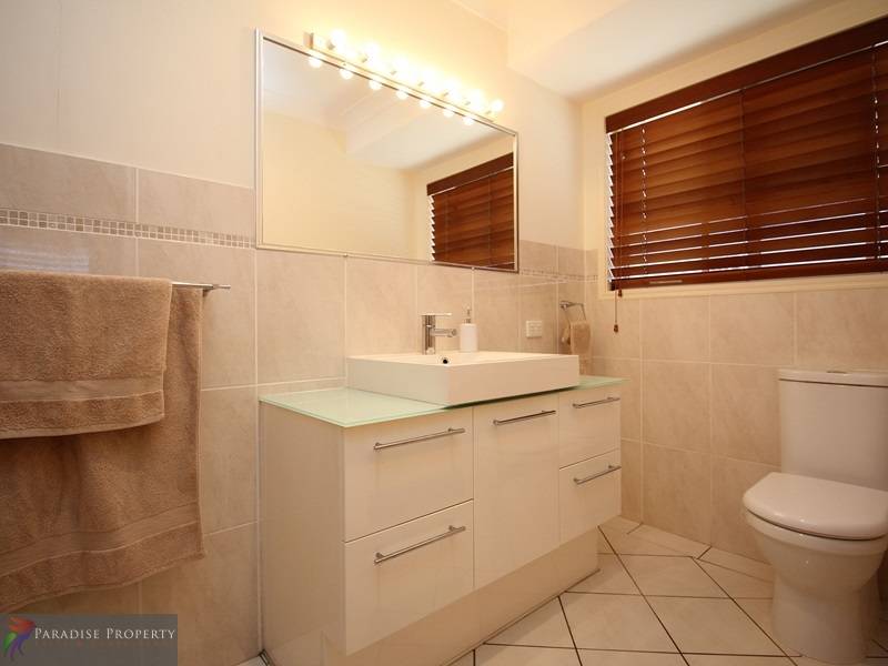 There’s 4 good-sized bedrooms (3 with air-conditioning + ceiling fans and all with BIRs) – the separate master bedroom is located at the front of the home for added privacy and features air-conditioning, triple wardrobe, extra storage space, pitched ceiling, beautiful arched window with timber shutters + renovated en-suite – with stylish vanity, good-sized shower and toilet.