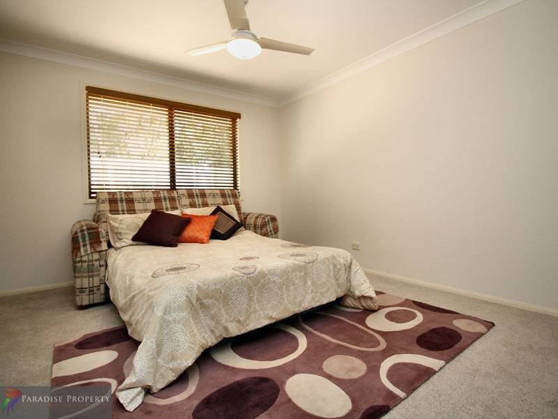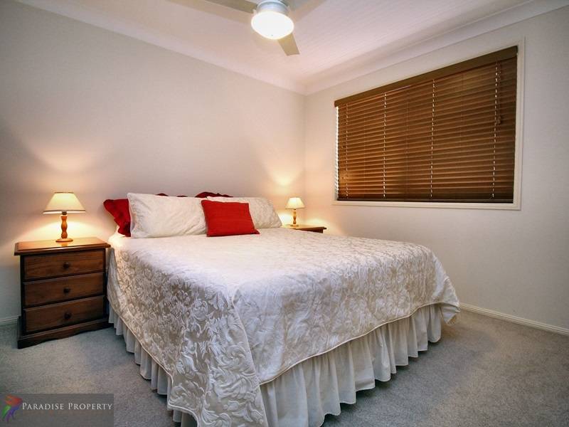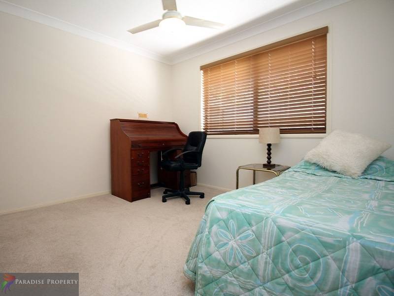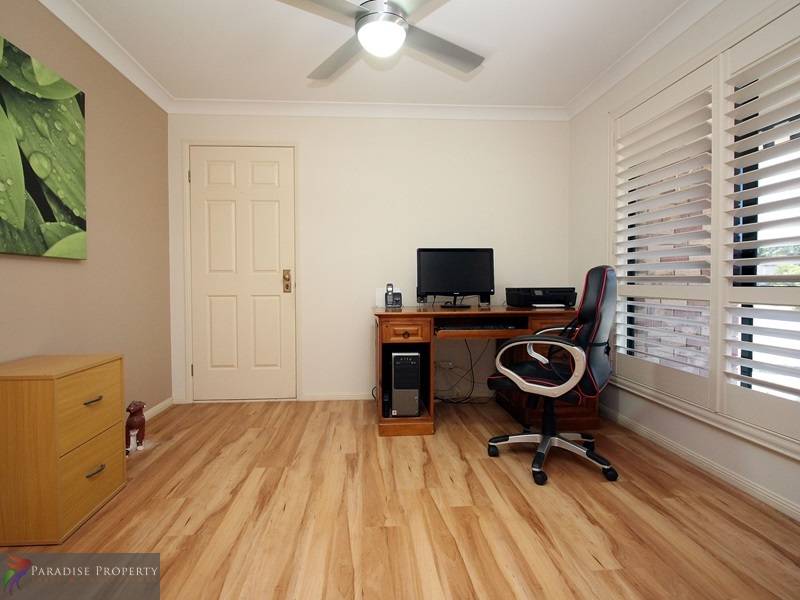 The adjacent study offers easy access to the double garage and has matching plantation shutters, ceiling fan, tinted windows and tough wearing laminate floor.