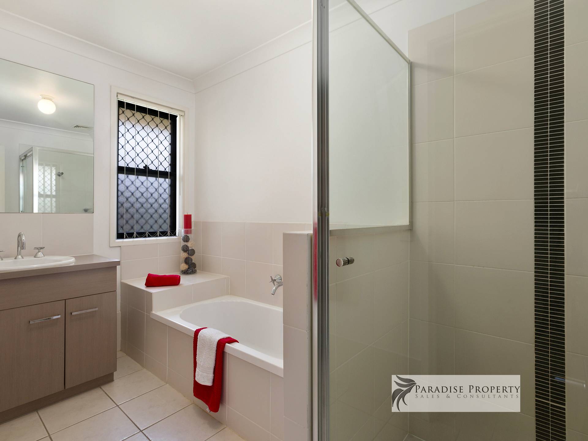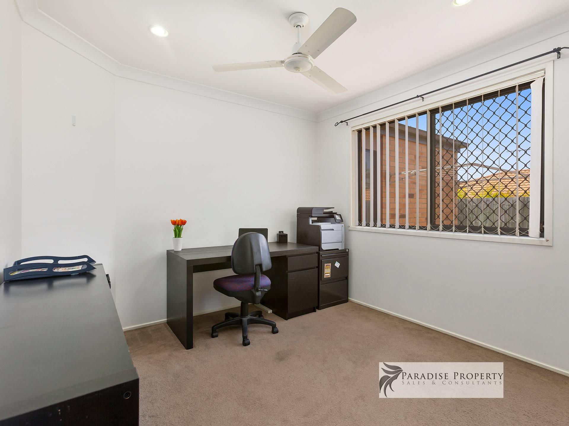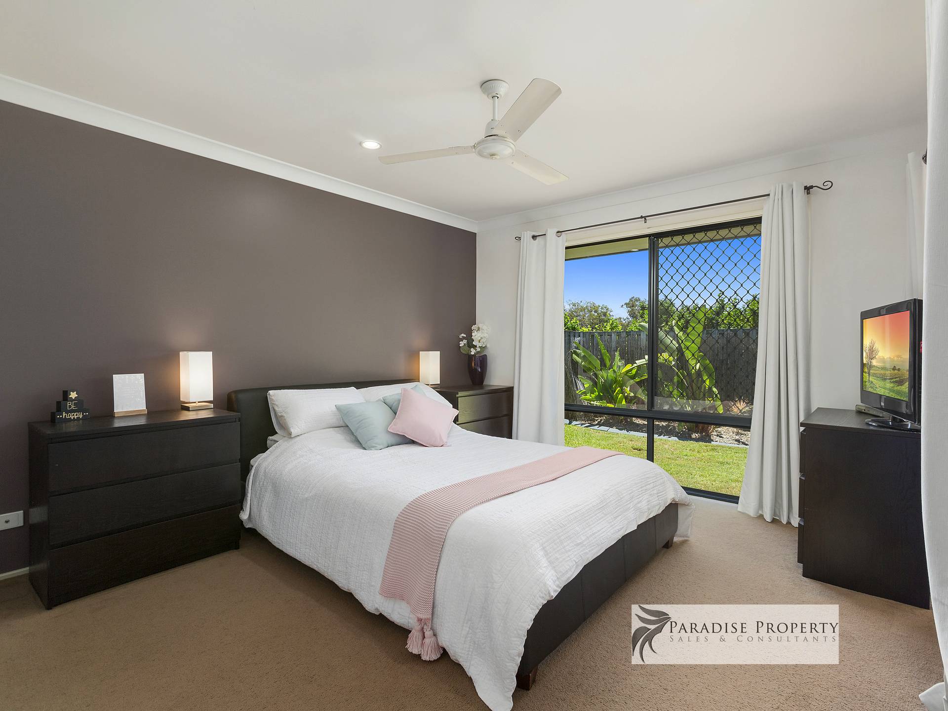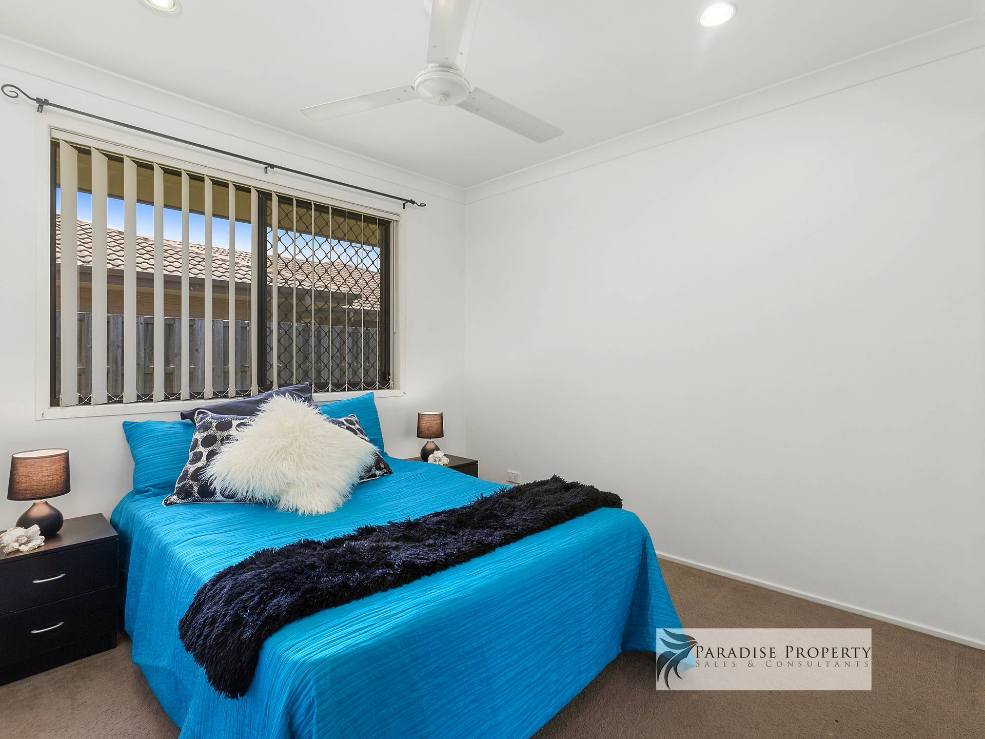 With 4 bedrooms (all with built-ins + ceiling fans) – including the separate master bedroom located at the back of the house with his and hers mirrored robes, en-suite with generous-sized shower, and sliding door access to outdoor entertaining.