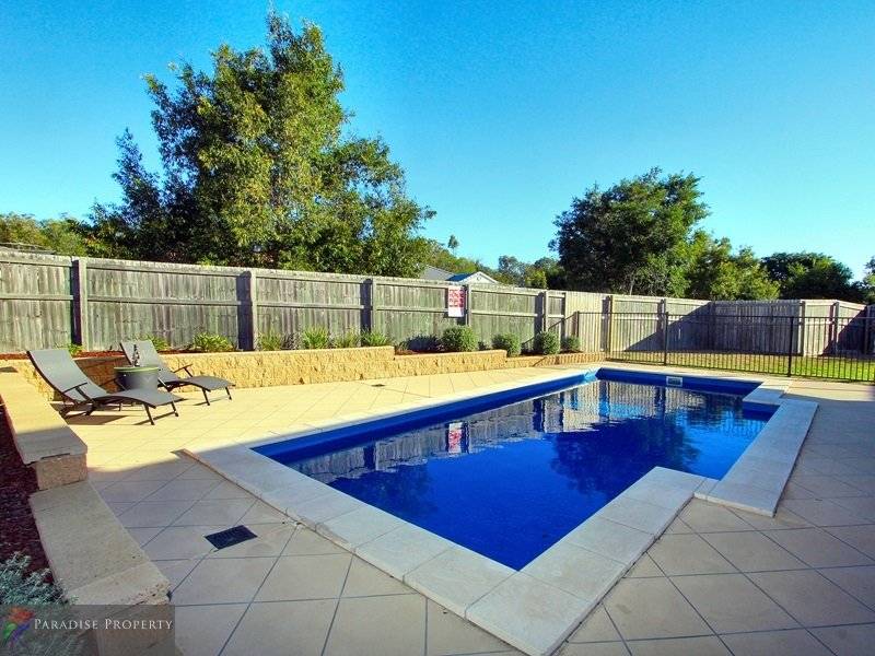 Enjoy outdoor entertaining under the expansive tiled patio that overlooks a sparkling saltwater pool showcased by feature glass fencing. Poolside, there is plenty of area to laze about with a good book or cool drink and to enjoy the sun. And, there is a nice grassed area adjacent for the kids swing set too.
