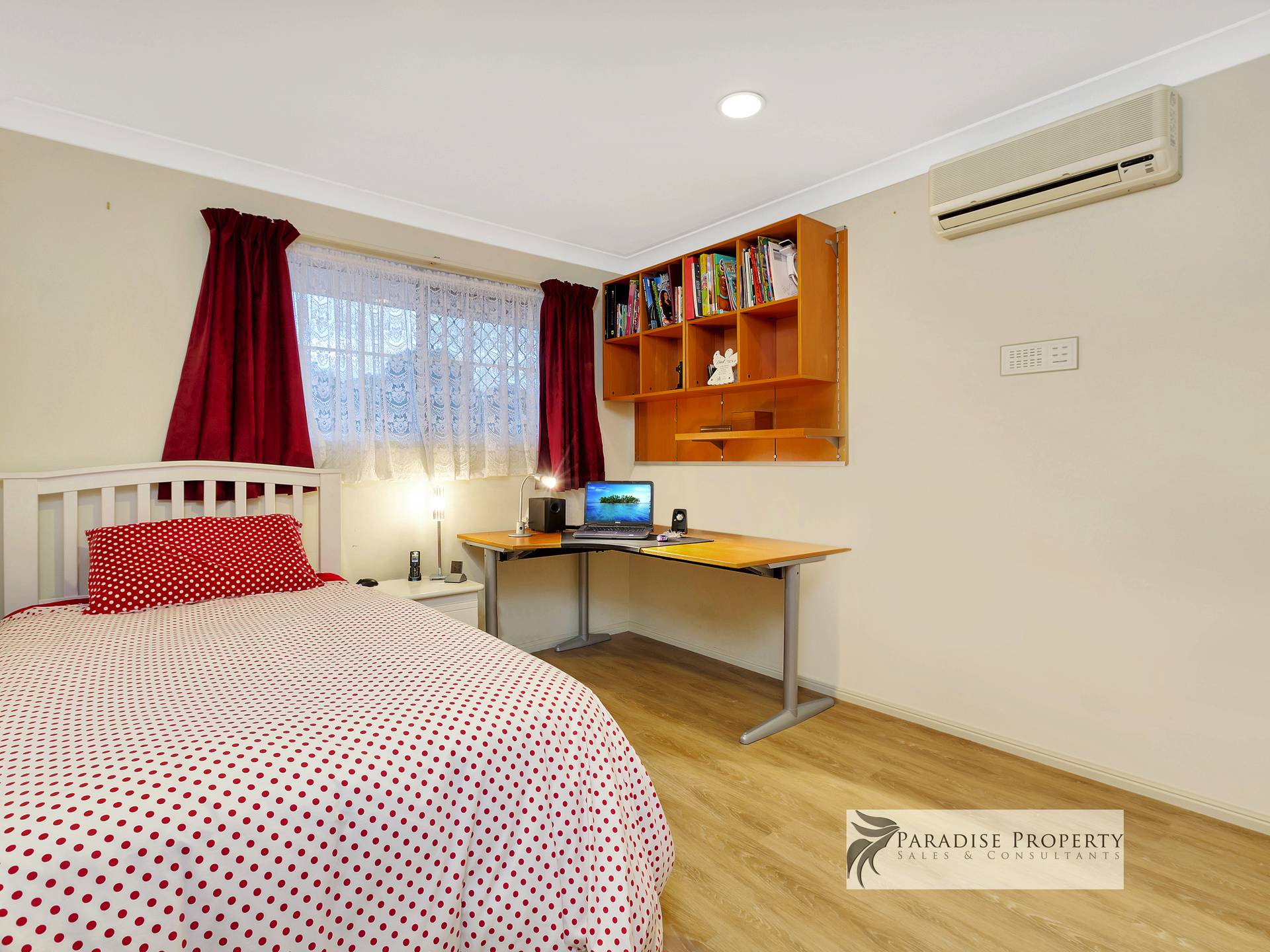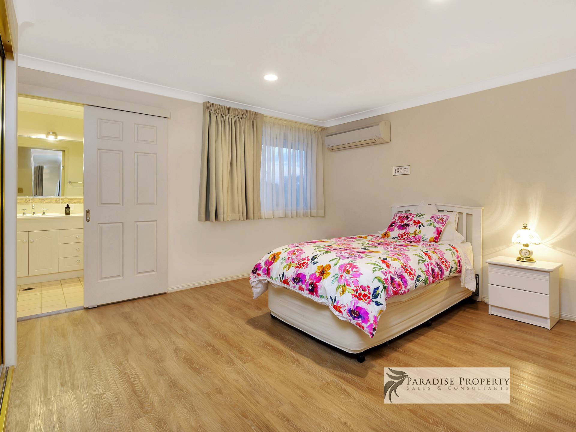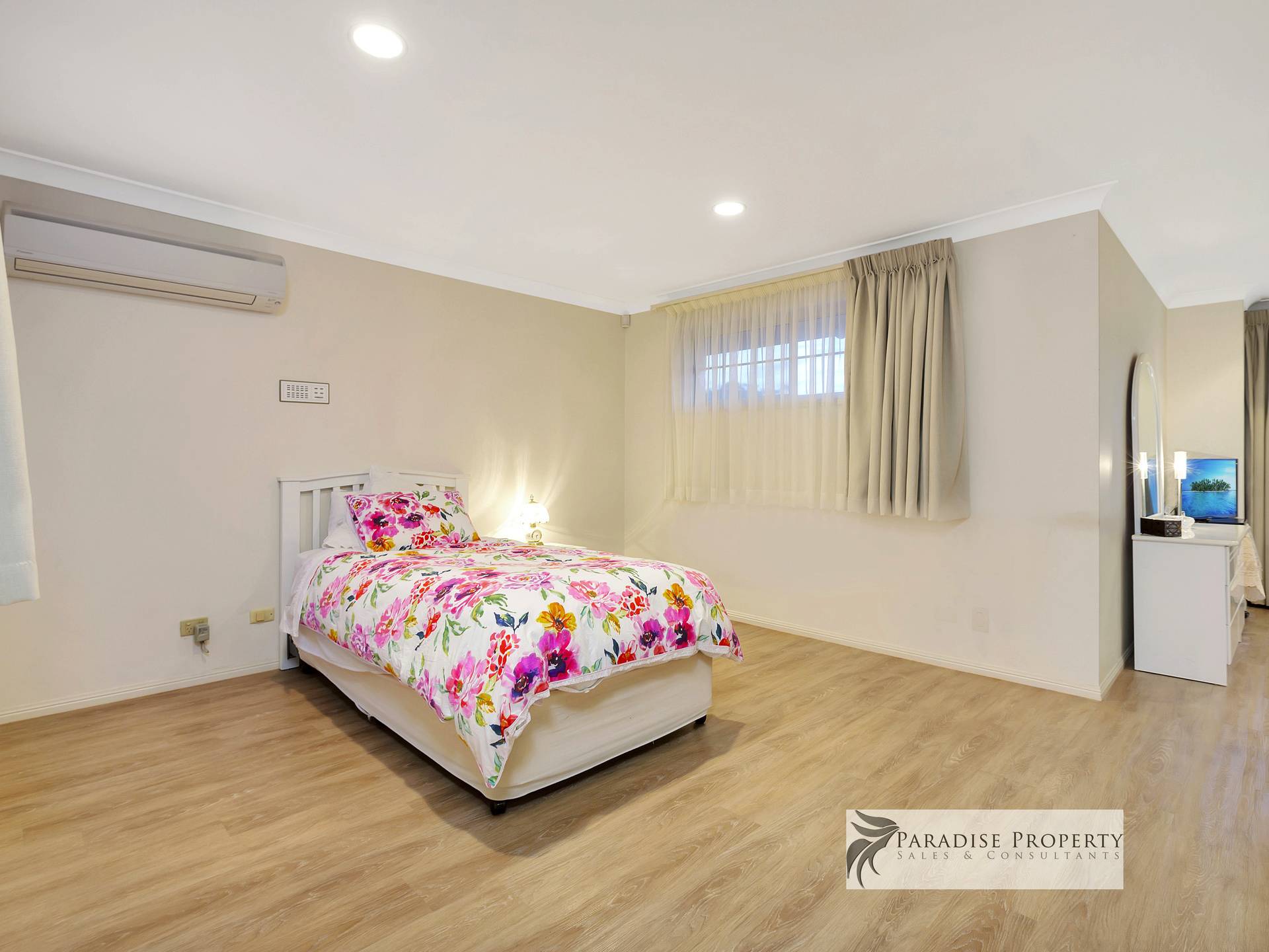 Upstairs you’ll find 4 generously sized air-conditioned bedrooms (each with BIR + allergy-free vinyl planking) – including the huge master bedroom with parent’s retreat/dressing room, WIR, extra wardrobe space + big en-suite with bath, shower, toilet + vanity. There’s also a good-sized main bathroom (with bath, shower + vanity) and a separate toilet too.