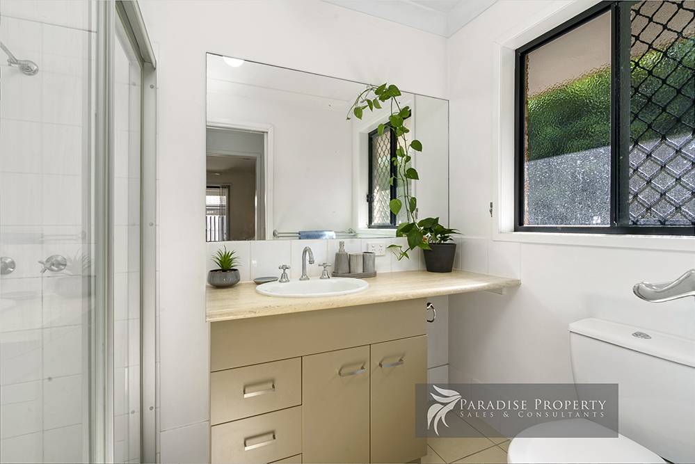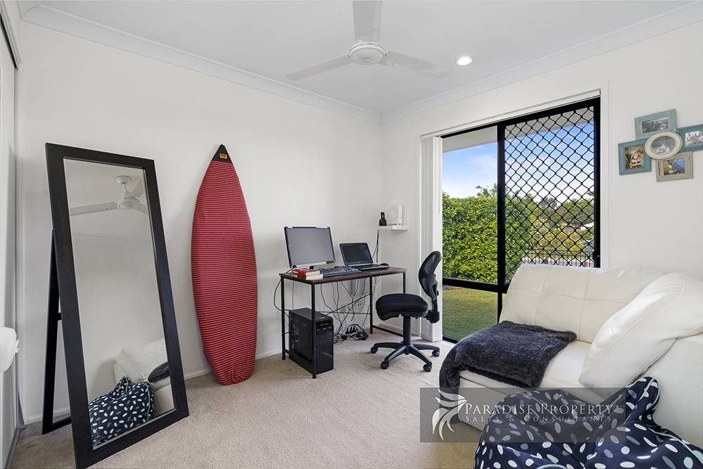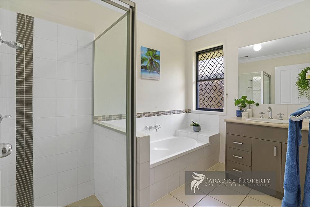 The home has 4 good-sized bedrooms (with BIRs + ceiling fans) – the air-conditioned main bedroom is located at the back of the house for extra privacy and has his & her walk-through robes, en-suite and private access outdoors.