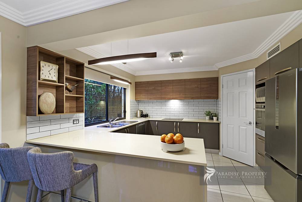 The contemporary new kitchen boasts stone benchtops and waterfall; custom cabinetry with soft-closing doors/drawers; quality Fisher & Paykel appliances (including twin-drawer dishwasher, s/s wall oven, ceramic cook top + concealed ducted range hood); breakfast bar; step-in pantry and large fridge/freezer space.