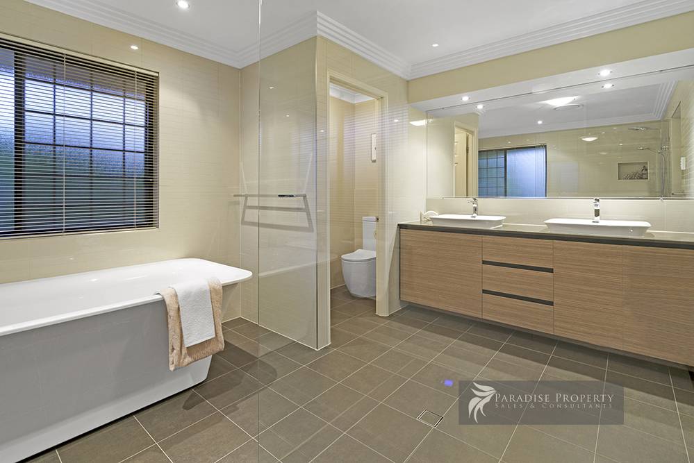 The big master bedroom has a custom-built walk-in robe plus a stylish new en-suite with floor-to-ceiling wall tiles, walk-in shower, luxurious deep bath, twin vanity with custom cabinetry + separate toilet for added privacy.