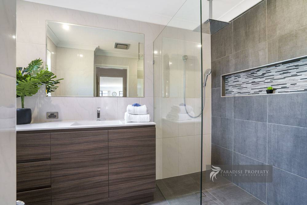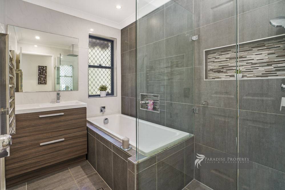 With 4 bedrooms – all with built-in robes and ceiling fans – the master bedroom is separate from the others with big tri-mirrored robe and stylish new en-suite – including beautiful vanity, floor-to-ceiling wall tiles, walk-in shower with twin shower heads and large recessed shelf.
