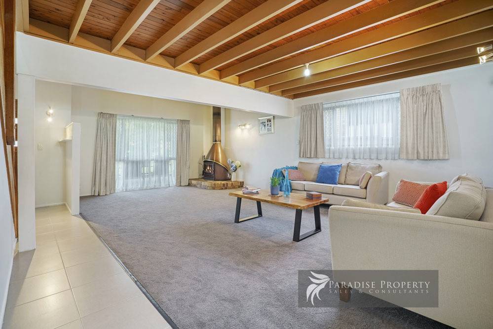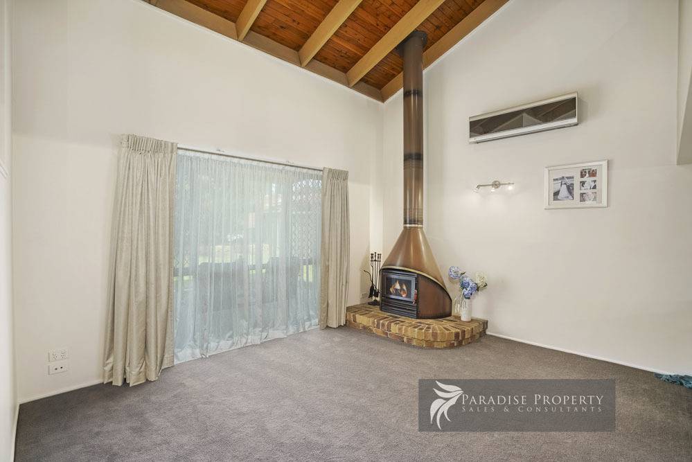 The downstairs floor plan includes a spacious, air-conditioned formal lounge with cathedral ceiling, slow combustion wood burning fire and soft new carpet; a tiled family room; a recently renovated laundry, and full bathroom with toilet, vanity + shower.