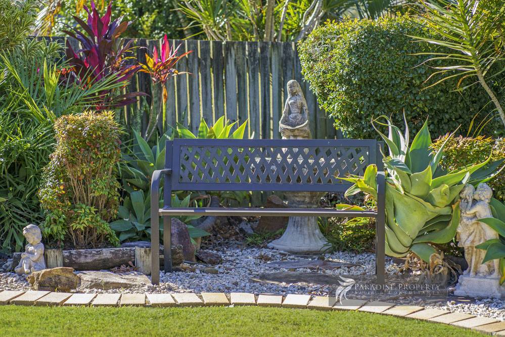 Enjoy outdoor entertaining under the enclosed covered patio (with ceiling fan + outdoor speaker) and embrace uninterrupted views of the beautiful established gardens with mature plantings, watering system, separate sitting areas, and meandering pathway.