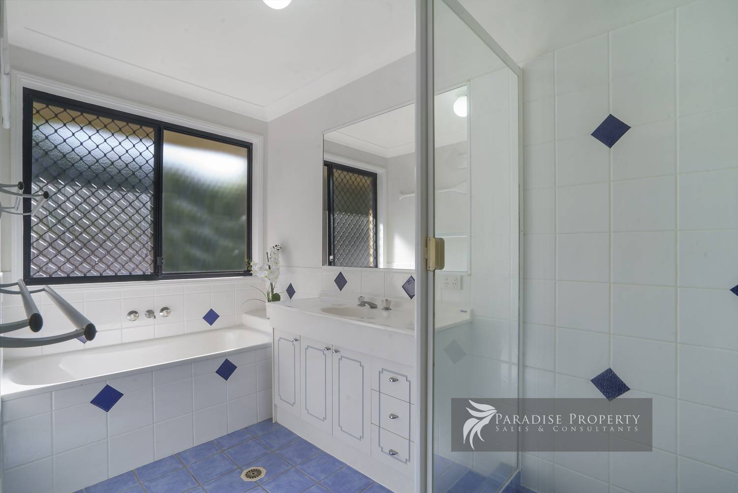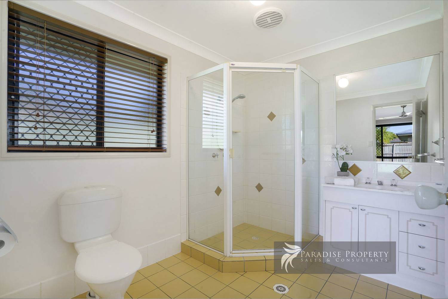 The main bathroom has a bath, shower, and vanity. And there’s a separate toilet and big laundry too.