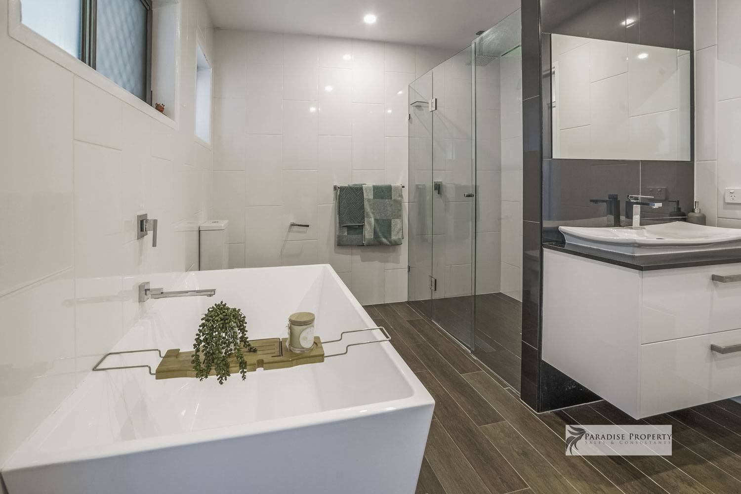 The stylish bathroom and integrated laundry are of equal high spec and quality finishes – with beautiful floor-to-ceiling tiles; luxurious deep freestanding bath; suspended vanity with soft-closing drawers; recessed shower with twin rain shower heads; stone bench top; and durable 2-pack gloss soft-closing cupboards as well.