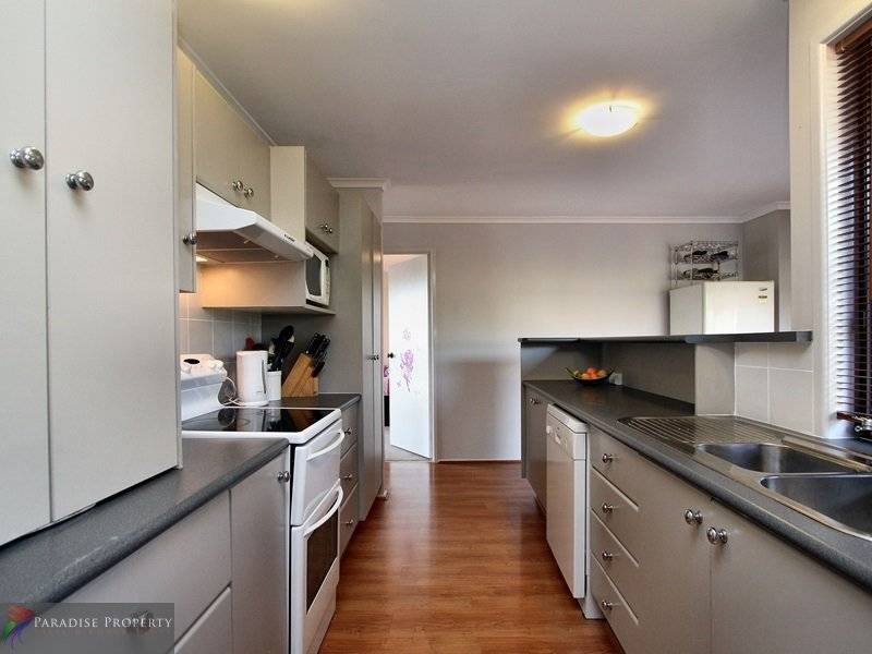 A central kitchen separates the formal and casual living to make it the focal point of the home. The galley-style kitchen has been given a contemporary renovation and includes plenty of bench and cupboard space, dishwasher and upright cooker.