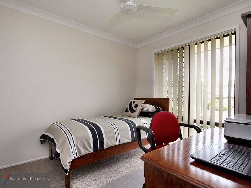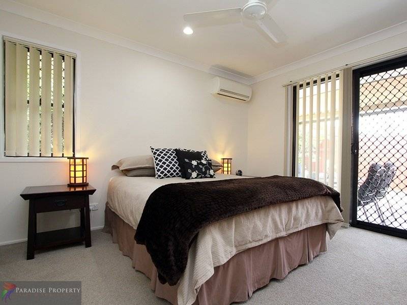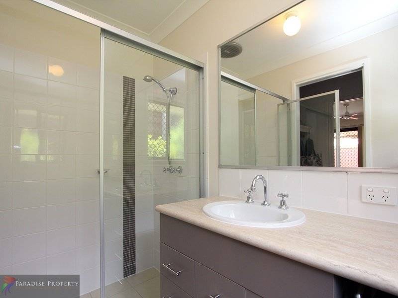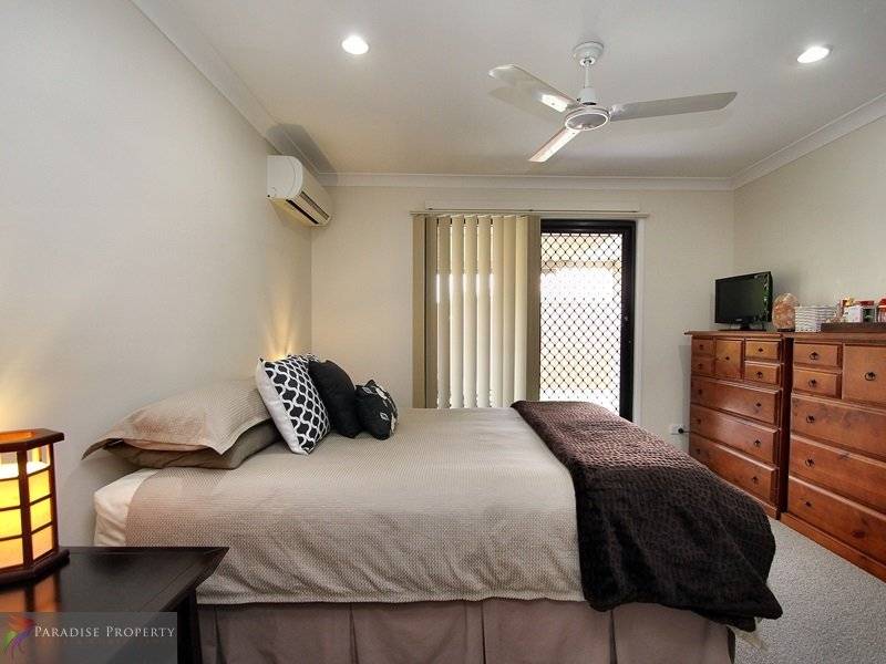 The home has 4 good-sized bedrooms (with BIRs + ceiling fans) – the air-conditioned main bedroom is located at the back of the house for extra privacy and has his & hers walk-through robes, en-suite and private access outdoors.
