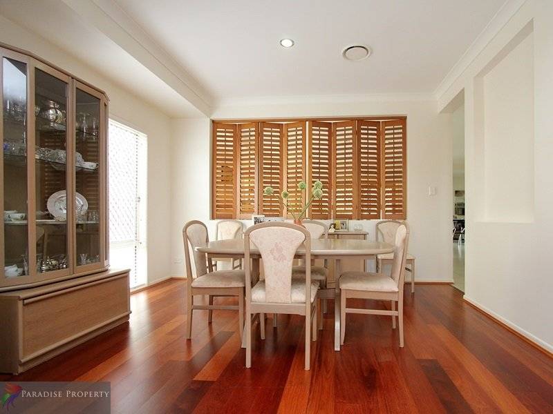 Beautiful merbau hardwood floors highlight the formal living and dining areas – which are separated from the casual living by quality timber shutters that can be retracted to blend the formal and casual living together.
