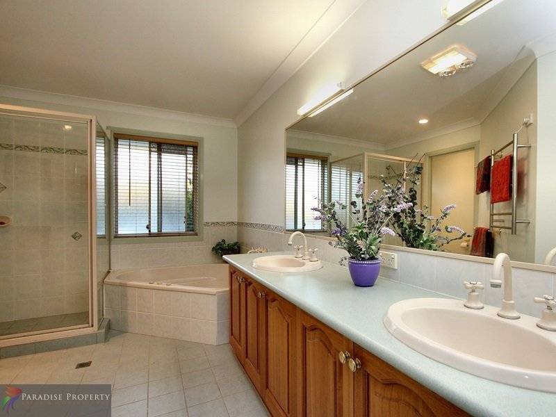 At the top of the staircase you’ll find 4 good-sized bedrooms (with BIRs) + a spacious main bathroom. The air-conditioned master bedroom is complete with ceiling fan, WIR and big en-suite with double vanity, shower, spa bath and heated towel rail for that extra bit of luxury.